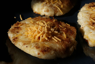 Take your left over mash and make it into patties. I had left over baked mashed potato casserole with all sorts of yumminess inside and cheese on top. The mashed potatos need to be cold.
